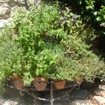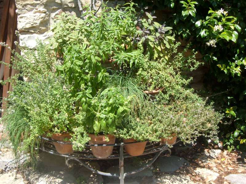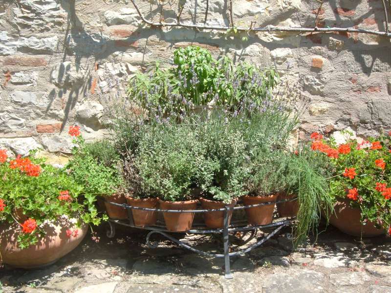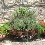 E che dire dei vasi delle erbe aromatiche? Nei portavasi in ferro battuto sono ordinate maggiorana, timi, erba pepe, dragoncello, svariate qualità di menta ecc….