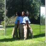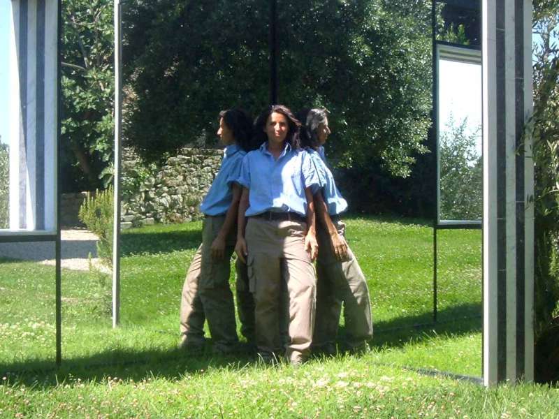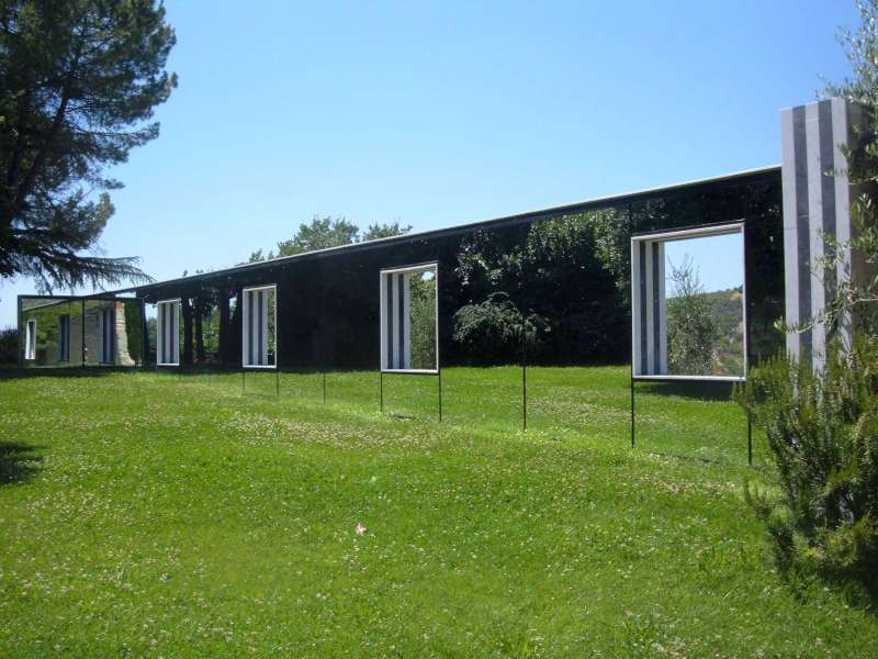 Dopo entriamo nella vecchia pineta e dopo pochi passi di lato al prato ecco che si erge maestosa la cornice di specchi di Daniel Buren. I suoi “punti di vista sulle vigne“, sono delle finestre che guardano le dolci colline del Chianti, finestre che si aprono sul muro di specchi lungo 25 metri, un muro che riflette tutto ciò che lo circonda e tutto ciò che gli passa davanti.