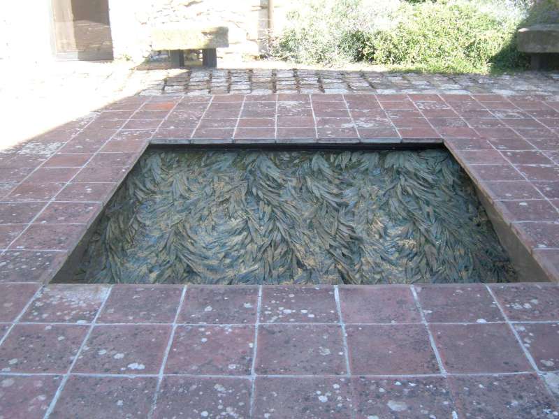 Infine, nel piccolo cortile dietro la villa, circondato da siepi di bossolo e lavanda, troviamo la “fontana” di Cristina Iglesias “Towards the Ground”. Sul fondo della fontana troviamo delle foglie in rilievo dove lentamente scorre l’acqua che sembra scendere giù fino al centro della terra…, lasciando a chi la osserva un senso di pace e tranquillità.