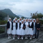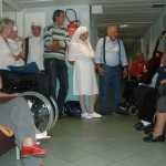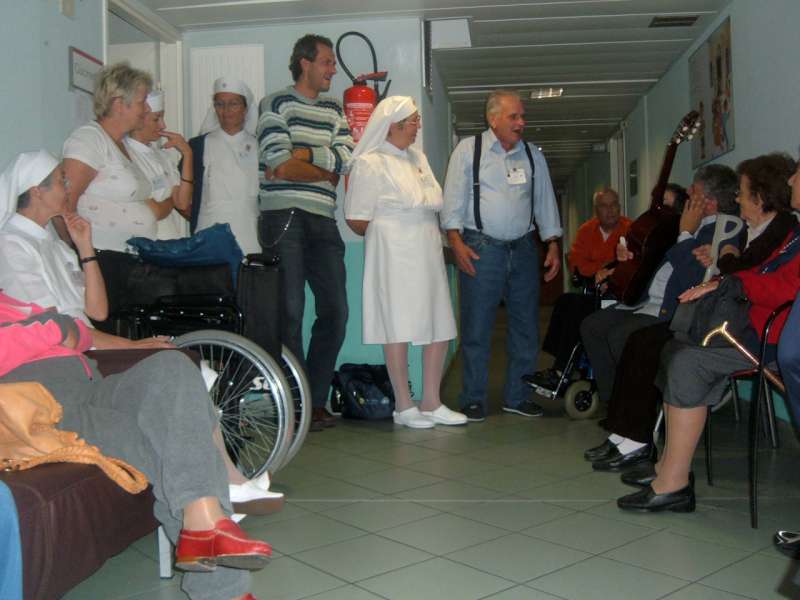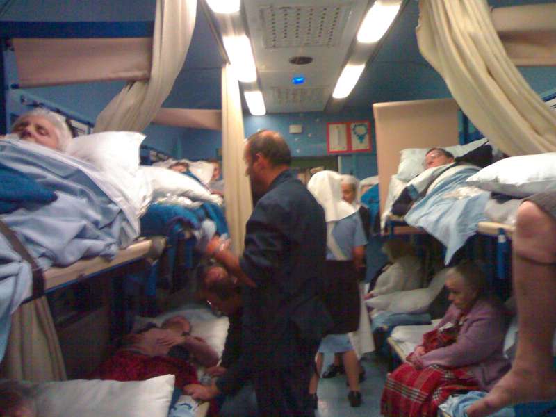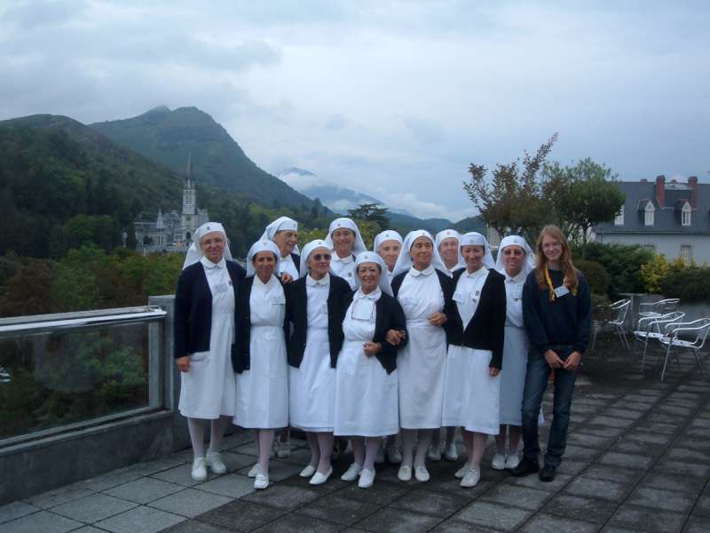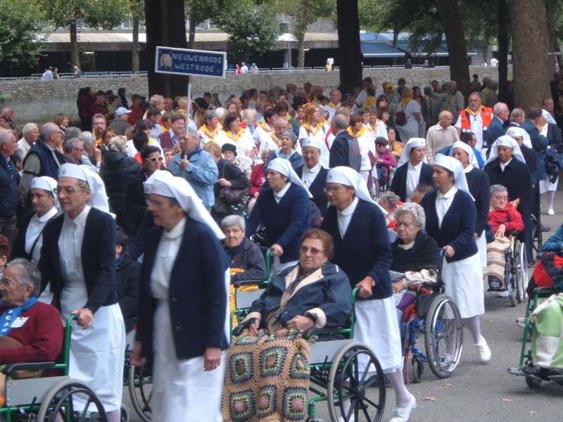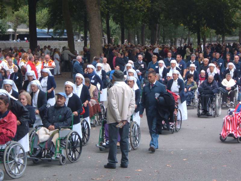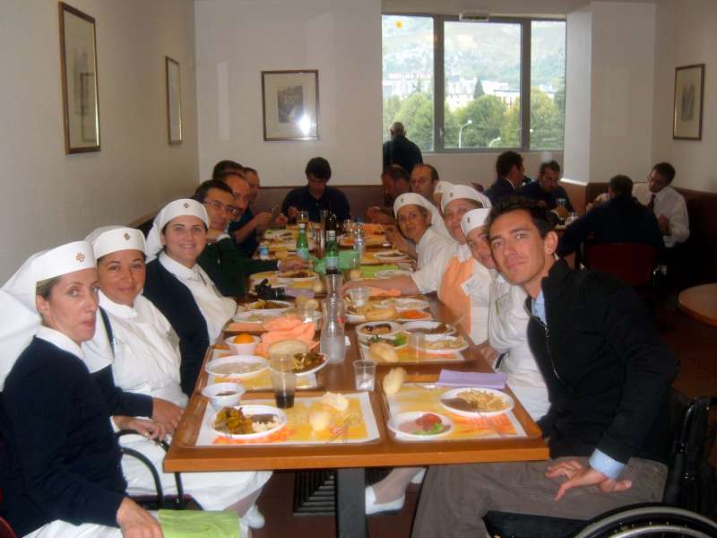 Ingrandite le foto, e vi renderete conto cosa è un “servizio” a Lourdes: sveglia presto, dobbiamo partire, dobbiamo arrivare al Salus, una lunga giornata ci aspetta. Aiutare Fiorella a vestirsi, dare le medicine a François, sentire Fulvio e Fabio dove vogliono andare, accompagnare Alemanno a prendere i biscotti dalle carmelitane, e prepararsi tutti insieme per andare alla Grotta.