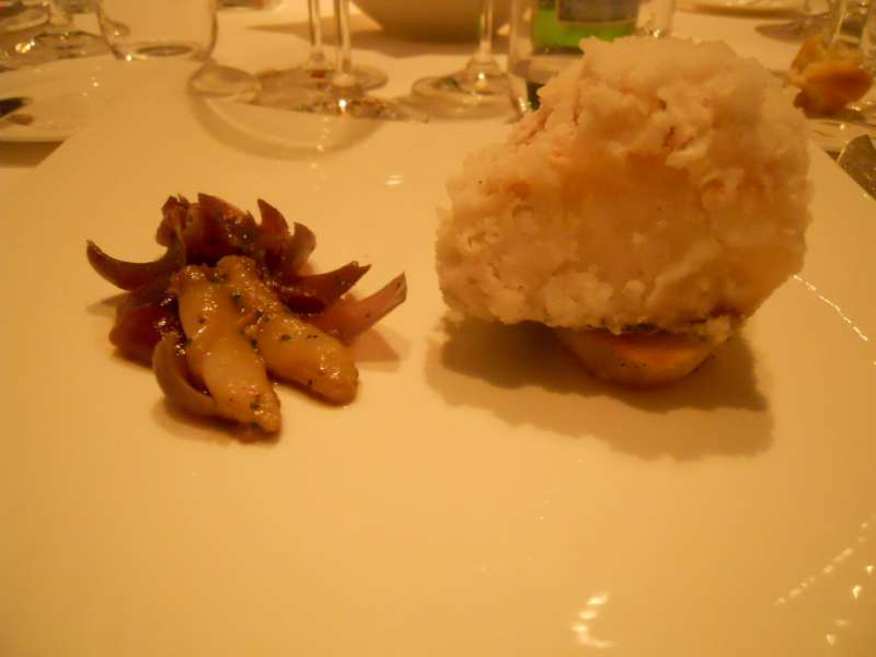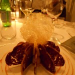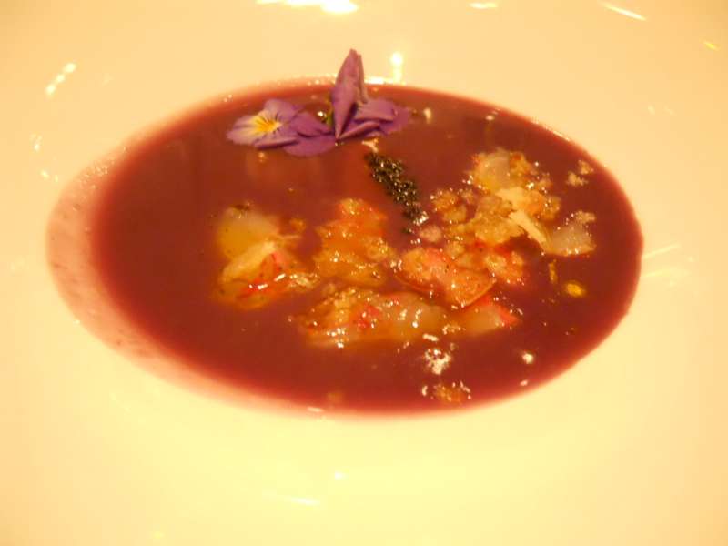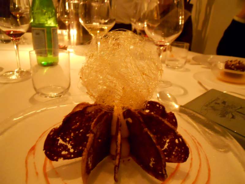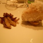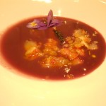 Partenza con insalatina tiepida di calamari e zucchine, ispirata al quadro “Coppia e Pesci“, resa croccante dall’aggiunta di pinoli. La “Sirena con Pesce“, ha ispirato la zuppa di patate viola, profumatissima. “I fiori saccheggiati“, hanno portato lo Chef a creare dei tortelli di pescatrice e vellutata di porri. Piatto curioso e insolito il “Circo Rosso” a base di merluzzo nero d’Alaska “ghiacciato”.