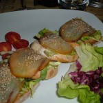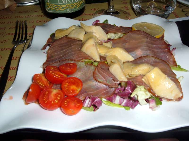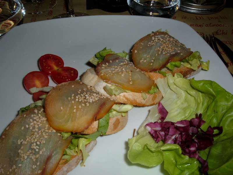 Fra gli antipasti è gustoso il carpaccio di tonno fresco e carciofi, per continuare, è azzeccato il contrasto fra la morbidezza dello spada affumicato al sesamo sui crostini tostati.