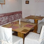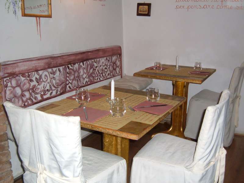 L’interno si presenta con sale a volta, ambiente raffinato, pareti affrescate dalla brava Livia, fuori delizioso dehors con vista mozzafiato sulla città, che in inverno è arricchito da stufe, per continuare ad ammirare il panorama mentre uno cena.