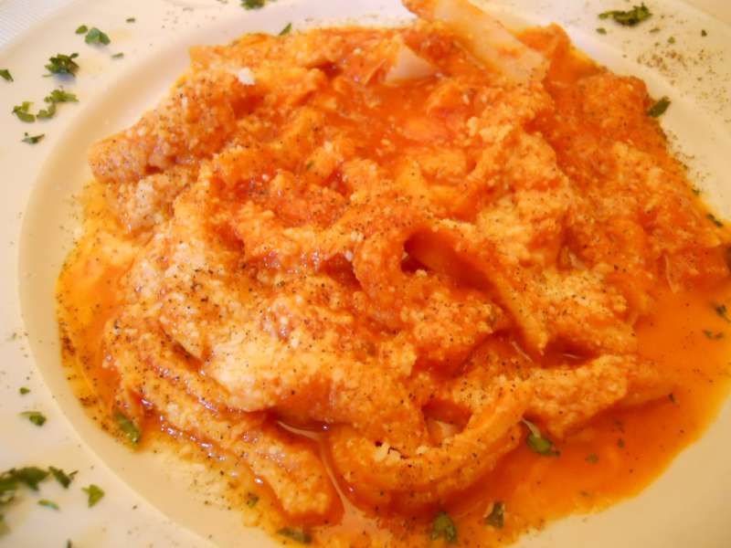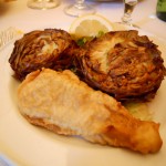 Si apre con l’antipasto di carciofi alla giudia e filetti di baccalà fritto, croccanti e ben eseguti. I paccheri pecorino e cozze sono sulla lavagna del giorno, e risultano gustosi e ben equlibrati.