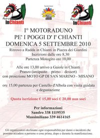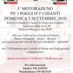 Per chi rimane in zona Chianti, stasera a Vertine e Lecchi nel comune di Gaiole, c’è la festa, a San Gusmè oggi e domani c’è la festa del “Luca”. Mentre domani c’è il 1° “Motoraduno perr i poggi del Chianti”. Ritrovo a Radda e inizio iscrizioni alle 8.30, partenza del giro alle 10.00.