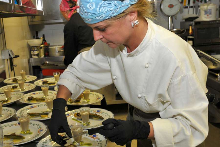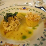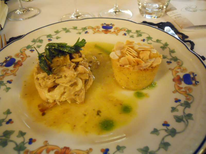 Bella la collaborazione tra Stefania Frache, padrona di casa del Convito di Curina e Emanuela Repetto da Portofino con i suoi profumi liguri. Ad aprire il menù “Pigne, noci e profumi del bosco”, un antipasto a quattro mani, composto da verdure ripiene di magro alla genovese , accompagnate da una crema di castagne e caprino.