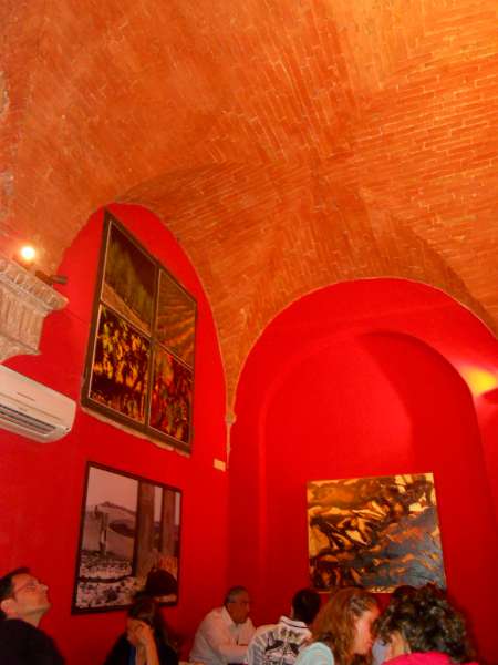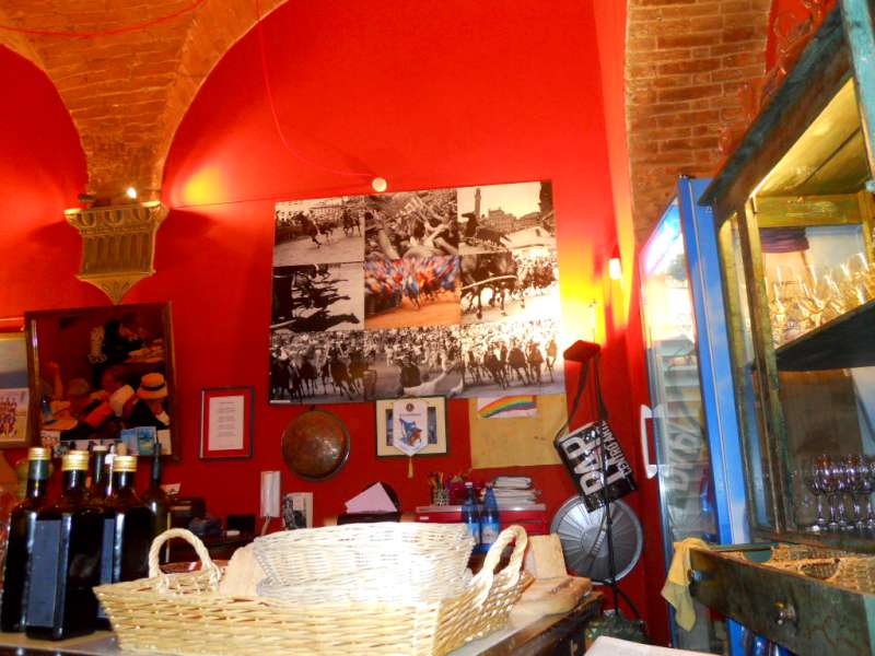 L’osteria è disposta su due livelli: nella prima sala, troviamo le pareti rosso aranciate, che subito ti danno un senso di calore,adorne di quadri sul Palio, piccoli tavoli di legno, il bancone nell’angolo e i vini ben esposti, dove, dalle etichette, si capisce che la cantina è ben gestita. Scendendo le scale ci troviamo nel cuore della città: una sala altissima, tutta a mattoni, con teche nelle pareti e la porta della cucina a arco: sembra proprio di entrare nel medioevo.