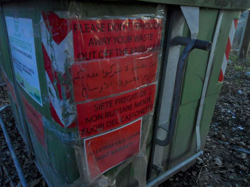Faccio i complimenti ad una nota azienda, che avendo i bidoni della raccolta dell’immondizia in una zona strategica (vedo, ma non vedo), ha pensato bene di aiutare immigrati, turisti stranieri e cittadini italiani locali e forestieri, mettendo su ogni contenitore fogli con su scritto cosa ci deve andare in tutte le lingue! Italiano, arabo, kosovaro, rumeno,inglese, francese, albanese ecc….Mi sembra una bella iniziativa e così non si può sbagliare!