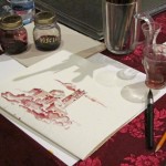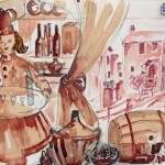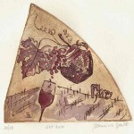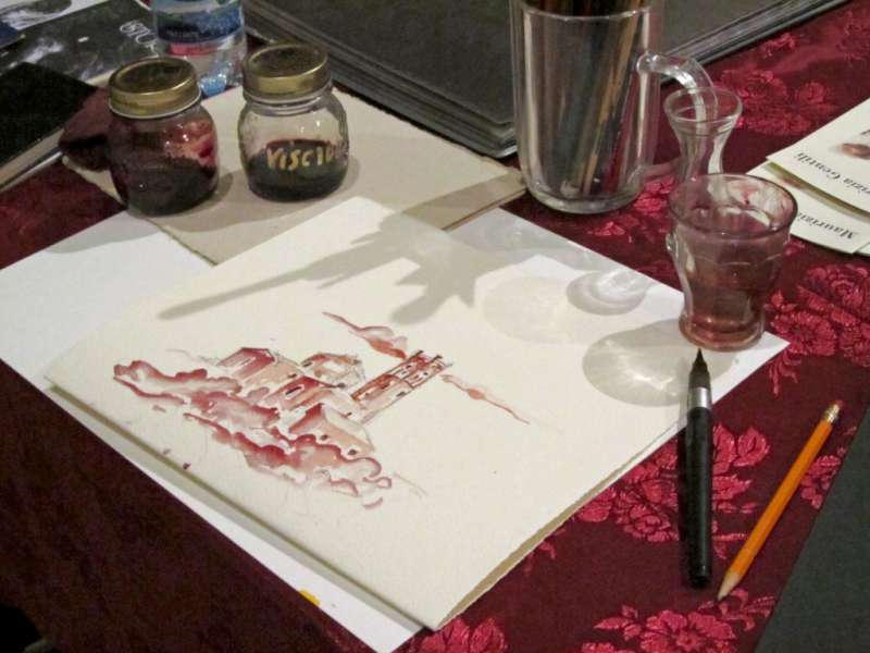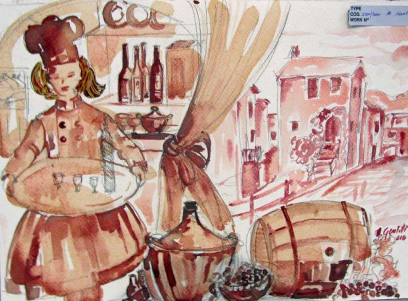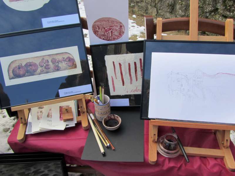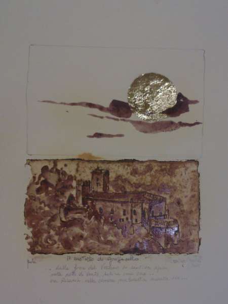 Ci accumuna il buon vino, quello del “mio” Chanti e il “suo”, dei Colli Piacentini: non a caso ha dato vita ai “Vinarelli”, quadri dapprima disegnati e poi successivamente dipinti con i pigmenti del vino! Il vino, che cambia da bottiglia a bottiglia, da territorio a produttore, da fresco ad asciutto. Un vino rosso capace, grazie ai tannini e alla loro ossidazione di dipingere un paesaggio dapprima giovane e allegro e con il passare del tempo, trasformarsi nell’effetto vissuto.. , e il vino è arricchito da colori pastello e foglia oro.