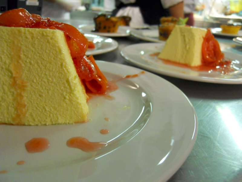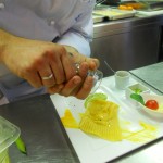 Maicol non è il solo rappresentante della Curia, insieme a lui c’è la bravissima, e anche titolare della “Curia“, Marialuisa Lovari, al quale sono affidati i dessert! Più che dessert, sono piccole opere d’arte, sia per la gamma dei colori che delle forme e consistenze: tortino di pere alla fonduta di cioccolato, crema bavarese con arance caramellate, crostatina alle fave e mirtilli con pomodori pachino caramellati, sformato di cioccolato bianco con salsa di fragole al peperoncino.