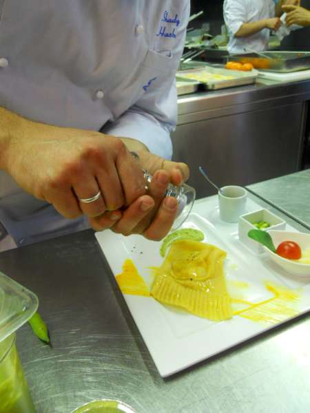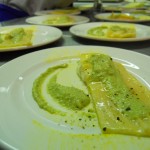 Shady Hasburn, del Ristorante LA CARTUCCIA, mezzo maremmano e mezzo palestinese, come ama definirsi lui, aiutato dalla brava Emy Brogi, stager dell’alberghiero “Vasari“, hanno dato vita allo scrigno di pasta fresca con cuore di pecorino e miele, accompagnato da crema di fave:bello il leggero contrasto tra la sfoglia grezza e la delicata crema di “baccelli”.