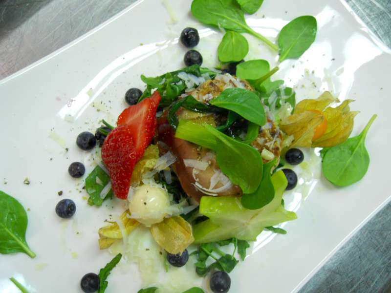 Secondi piatti: bocconcini di pollo e ananas con cipolla di tropea, salsa “gastrica”, filetto di cinta senese in crosta di pinoli, spezzatino con verdure croccanti, tamburino di maiale con rigatino, rombi di verdure , porro e riduzione al balsamico.