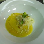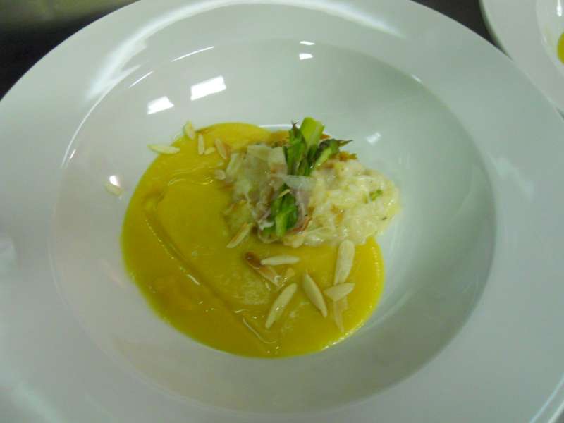 Cupola di risotto con provola affumicata al profumo di carciofo, su vellutata di carota, accompagnata da asparago al bacon e mandorla tritata, è tanta roba lo so…sia per la lunghezza del nome del piatto, ma soprattutto per la delicatezza e la croccantezza, nel gustarlo. Un insieme di sensazioni, volutamente contrastanti, nate dalle abili mani del carismatico chef Gianni Molti.