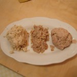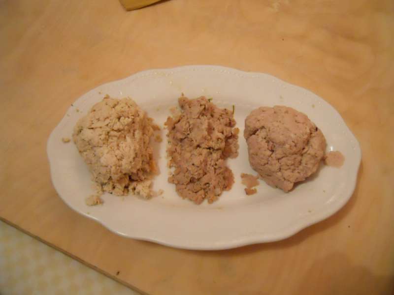100 gr di lombo di maiale tagliato a pezzetti e rosolato nel burro, 100 gr di prosciutto crudo, 100 gr di Mortadella di Bologna, 100 gr di Parmigiano Reggiano, 1 uovo intero, noce moscata, sale.