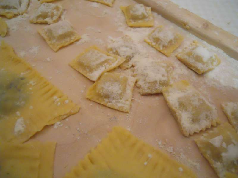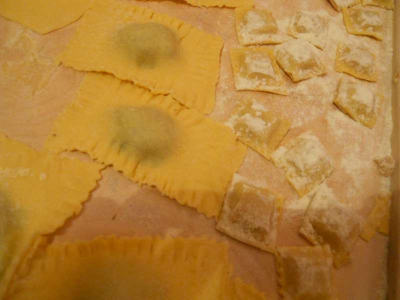Passare la ricotta e gli spinaci attraverso il setaccio. Metterli in una zuppiera, aggiungere il resto degli ingredienti, lavorare l’impasto con un cucchiaio di legno fino a che non si ottine la farcia morbida. Tagliare una striscia di pasta all’uovo larga 7-8 cm, distribuitevi dei mucchietti d’impasto ben distanziati, coprite con un altra striscia di pasta all’uovo, pressate bene intorno al composto e con lo stampo ricavatene dei ravioli.