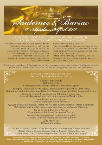 Domenica 17 aprile la Francia Dolce è al FOUR SEASONS di Firenze: l’evento vedrà la presenza di dodici produttori dei “Crus Classès”: degustazione di tre vini di annate diverse per ciascun produttore nella Lobby L’Orangerie, dalle ore 15.00 alle ore 19.00 € 35.00 per persona. Aperitivo nella Lobby L’Orangerie a partire dalle 20.00, seguito da una Cena al Ristorante Il Palagio – € 95.00 per persona.