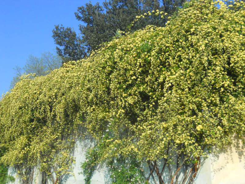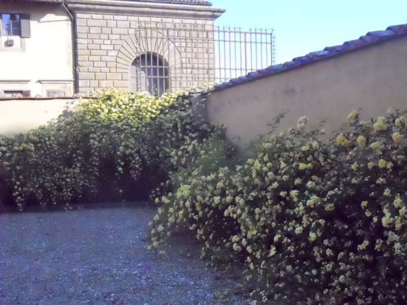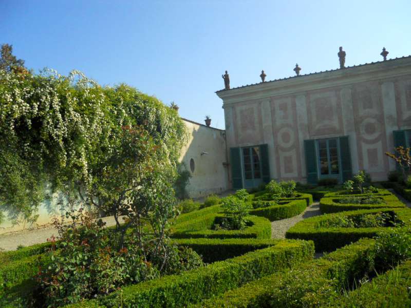 Al Cavaliere, solito gioco di rose e bosso, ma invece che essere circondati dall’acqua, siamo protetti da un grande muro dove regnano le rose rampicanti, e la vista spazia fino alla collina di “Bellosguardo”. Alla Limonaia, domina la grande struttura pastello che fa da sentinella sulle aiuole profumate.