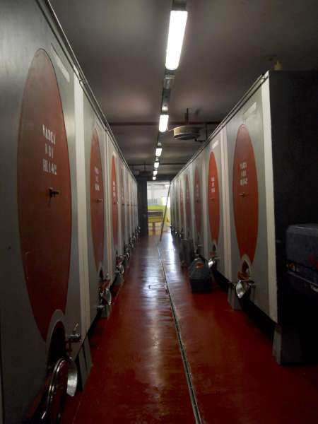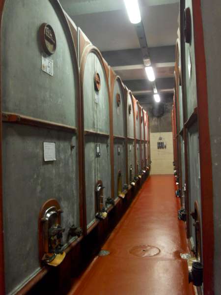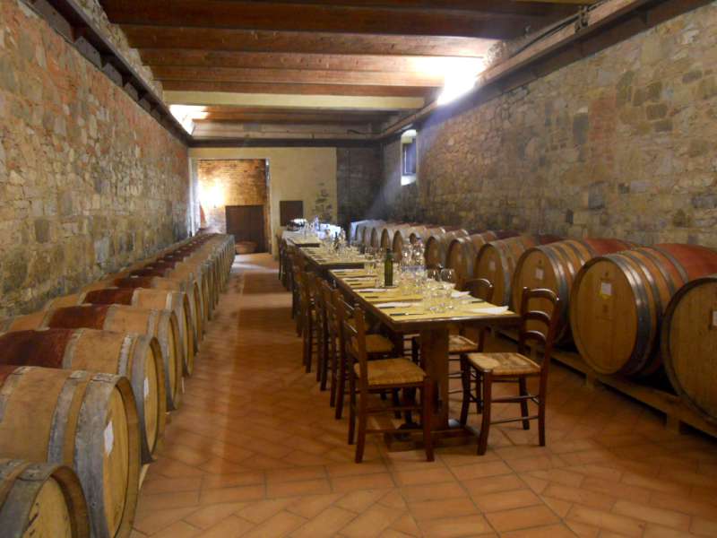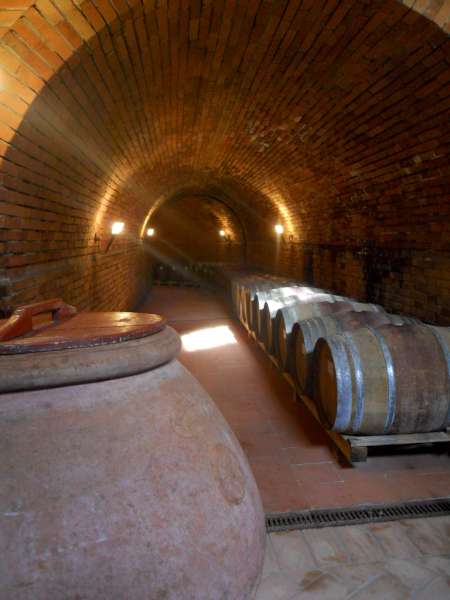 Un “tunnel” di mattoni, fa da traghettatore con la cantina nuova: quì troviamo le vasche di cemento da 150 e 142 hl, e le piccole botti del Vin Santo, fatto con Malvasia Bianca e Sangiovese. La tradizione vuole che le botti stiano in alto nella “Vinsantaia”, ma da poco tempo nell’azienda si sta tentando questo “esperimento” che sta portando a buoni risultati, il 1998 è veramente ottimo.