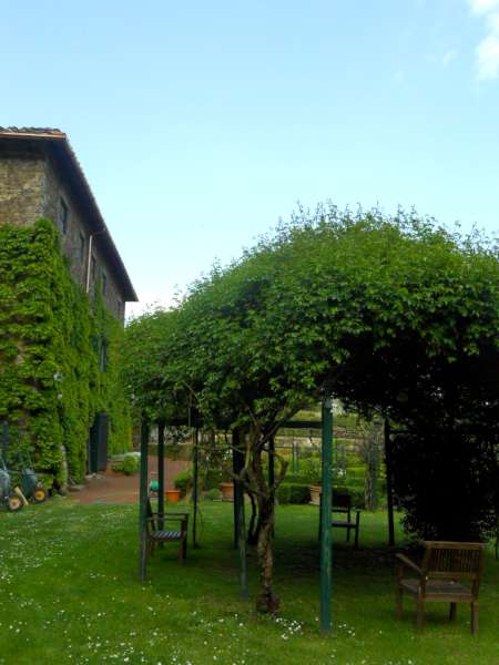 Una caratteristica del giardino, posto su più livelli, sono i lunghi “berceaux” di legno sui quali si arrampicano viti d tavola e glicini favolosi. Le colonne che sostengono i rampicanti, sono dipinte di verde vivo, e i pali che coprono la struttura sono volutamente lasciati allo stato libero: un’opera di architettura che si è mantenuta originale negli anni. Rotondeggianti “bersò”, come dicono gli italiani, di rosa banksiae e di laurus nobilis, attendono l’ospite a riposare, con la loro ombra e la loro quiete. Le siepi di bossolo, formano dei quadrati perfetti, disegnando giochi simmetrici e regolari, che variano di misura e che al loro interno ospitano prati all’inglese e la collezione degli agrumi. A metà del giardino, troviamo due belle bordure con il giaggiolo del Chianti; un esplosione di profumo e di colore viola.