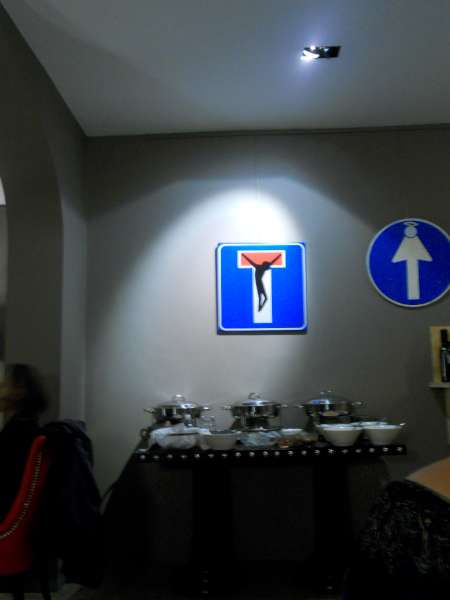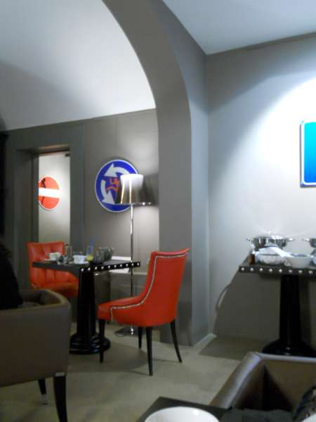 Il locale è molto bello, allo stesso tempo familiare, ma rilassante, con due sale, una delle quali guarda sul bel cortile di un palazzo storico della città (Palazzo Bardi alle Grazie), e un angolino intimo vicino al camino, ideale nelle giornate fredde o piovigginose. Alle pareti ci sono i famosi “cartelli” del Clet, l’artista, che fa impazzire gli automobilisti di Firenze con le sue originali trovate