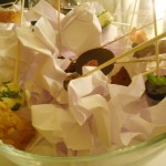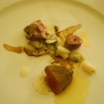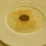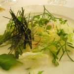 Gia lo “chef-giardiniere” verrebbe da dire, perchè nelle sue preparazioni non manca mai un fiore, un erba, un semplice…Tutti i piatti sono fondati sull’abbinamento di eleganza e freschezza, disinvoltura e charme, sensi e sapori, a partire dal menu, che si apre con la scritta “Oggi” in molte lingue, e che offre la sorpresa: la sorpresa sono tutti i piatti che crea lo chef, ma a primo impatto non sapremo cosa mangeremo, tutto cambia, tutto ritorna, una danza di portate che non sarà mai uguale al giorno prima, tranne per l’insalata di alghe, erbe aromatiche (c’è anche la ruta, che pochi usano, mangiano e conoscono!) e radici. Proprio da queste “radici“, inizia il percorso della cena, anzi più che della cena, della scoperta..