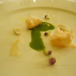 Granita di acqua, semi di sedano, cozze e fiori di limone, ovvero la freschezza del mare legata agli agrumi, poi come in un quadro di Mirò, ecco gli “elementi” che danno vita al piatto “caviale, mallo di noce e liquirizia”. La delicatezza degli scampi,la dolcezza della mandorla, unite dai fagiolini. Poi arriva lei, la “Royale” di aglio al pistacchio. Come descriverla? Seducente, per la crema di aglio, golosa per lo zucchero cristallizzato, innamorata per il cuore di pistacchio.