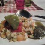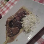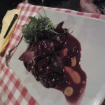 Un morbido tuffo carnivoro tra bistecca, tagliata e filetto, ma anche fichi e ciliegie che si trasformano in un morbido giaciglio per l’aromatico petto di anatra, e una piccola attenzione anche per i “vegetariani” con l’insalata di frutta e verdura a cubetti guarnita di pesto al gelsomino, che volendo vi potete far portare come antipasto come ho fatto io. Sogni di dolcezza per terminare il pasto come le peschine, la torta cioccolato, peperoncino e ciliegie o la sfogliata di pere e cioccolato con gelato alla grappa.