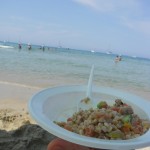 Partiamo dal presupposto sbagliato, che non troveremo da mangiare, partiamo dal presupposto giusto che per arrivare alla spiaggia bisogna camminare. Al parcheggio c’è un chiosco che vende frutta fresca, e quasi arrivati alla spiaggia c’è un banco che vende panini e da bere e nel pomeriggio arriva anche la macchinina che vende i gelati, quindi se volete evitare di portare borse pesanti per quasi 2 km, sapete che bere e mangiare ci sono.