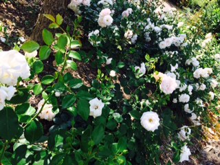 Il mio consiglio è, se ve ne accorgete in tempo, di fare un trattamento per le rose. Quelle che vedete nelle foto sono Aspirin Rose in un unica aiuola, ed è una delle migliori rose tappezzanti che rifiorisce tutta la stagione, dalle corolle bianche che sfumano al rosa pallido.