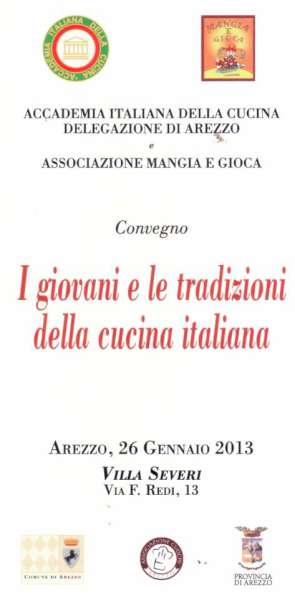 25/01/2013Segnalo questa simpatica iniziativa in programma per domani mattina, sabato 26 gennaio a Villa Severi ad Arezzo. La Delegazione di Arezzo dell’Accademia della Cucina Italiana, organizza, in collaborazione con il Centro Nutrizionale Mangia e Gioca, il Convegno ” I giovani e le tradizioni della Cucina Italiana”. Il fine di questo incontro è quello di stabilire un filo conduttore tra le nostre tradizioni alimentari e lo stile di vita moderno. Alla fine del convegno ci sarà il pranzo, “cucinato” dagli allievi…